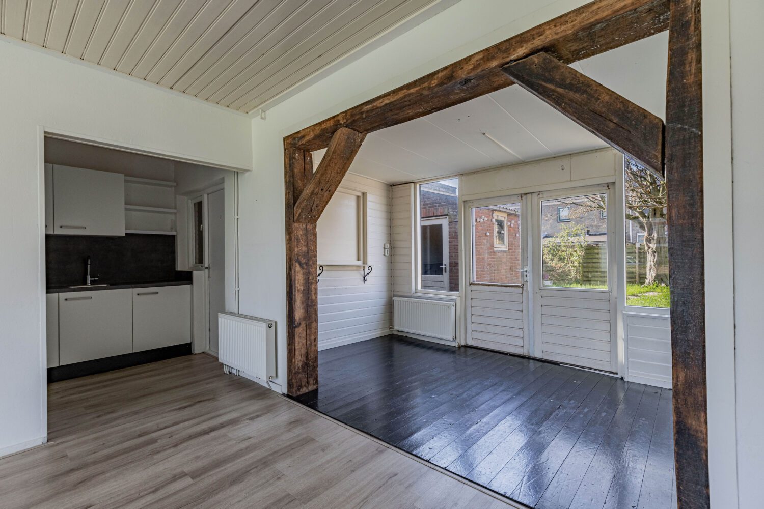 De woning beschikt over een lichte doorzonwoonkamer met aansluitend een aanbouw, wat zorgt voor extra leefruimte op de begane grond. De halfopen keuken staat in verbinding met de woonkamer en biedt daarnaast toegang tot een praktische bijkeuken, ideaal voor extra opslag en witgoedopstelling.