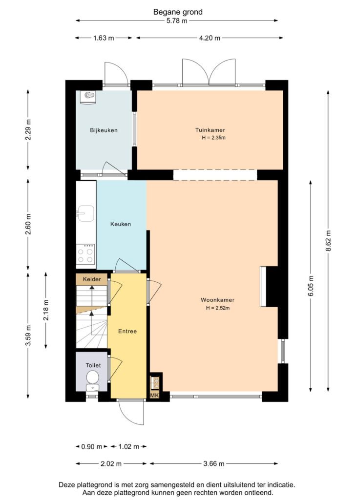 Indeling: entree/hal, toilet, trapopgang, kelder, woonkamer, keuken voorzien van inductie kookplaat, oven en vaatwasser. Via de keuken kom je in de bijkeuken met cv-opstelling en witgoedaansluiting en deur naar de diepe achtertuin.
